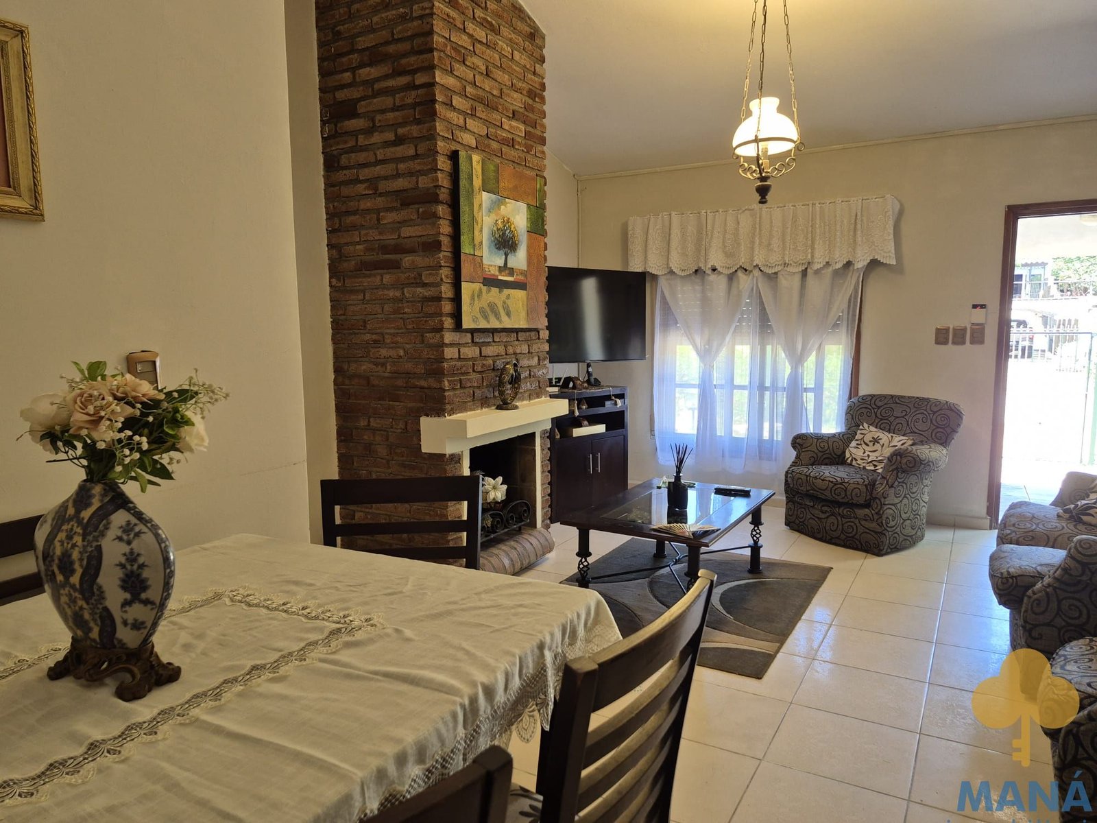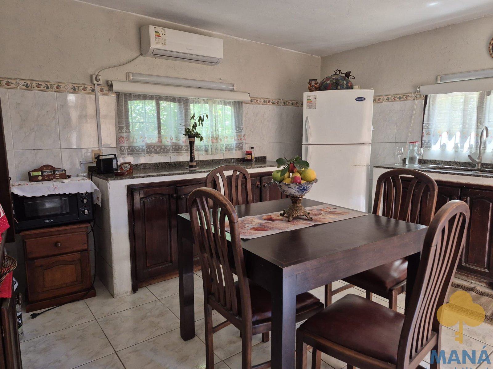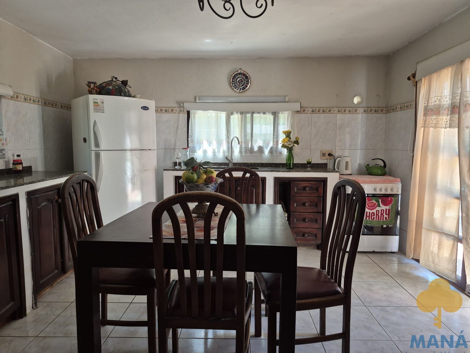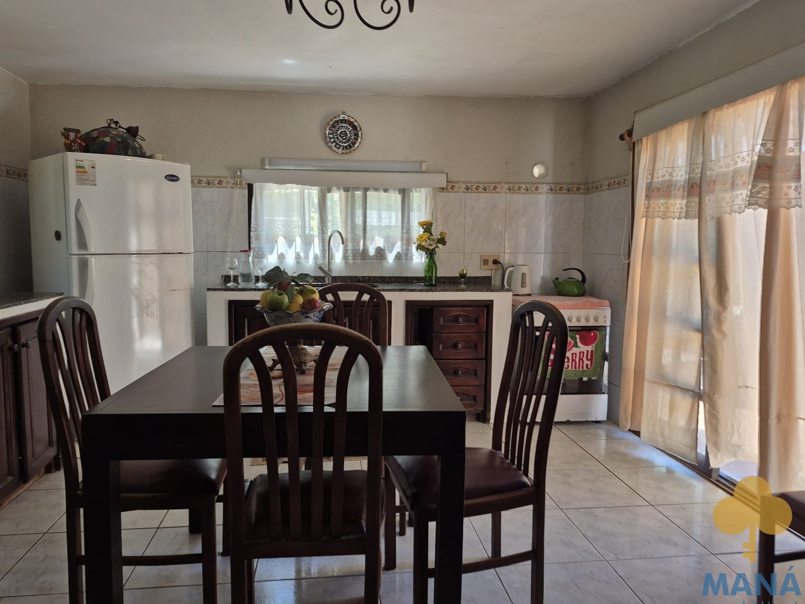 Living comedor con estufa a leña, amplia cocina comedor definida con placares bajo mesada.