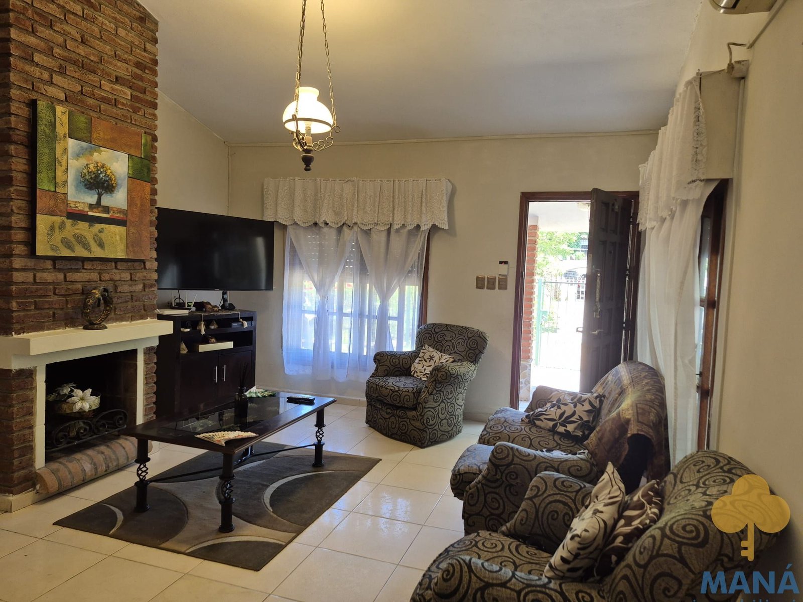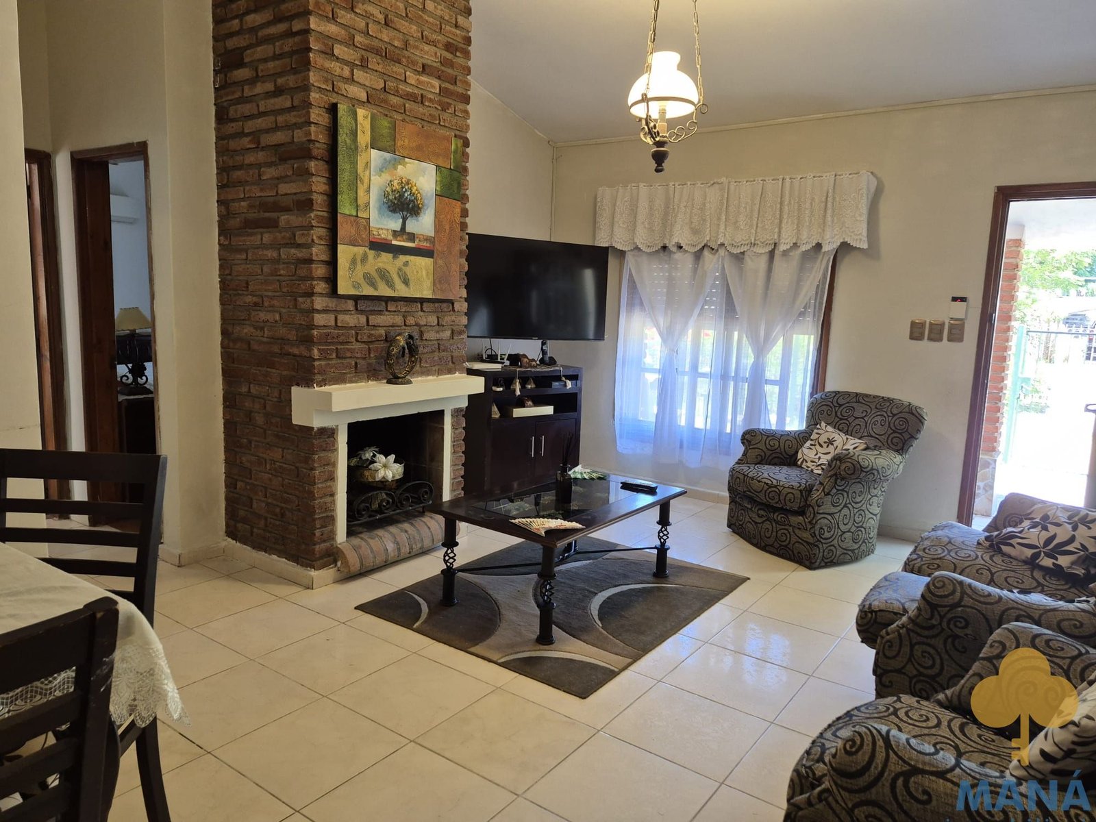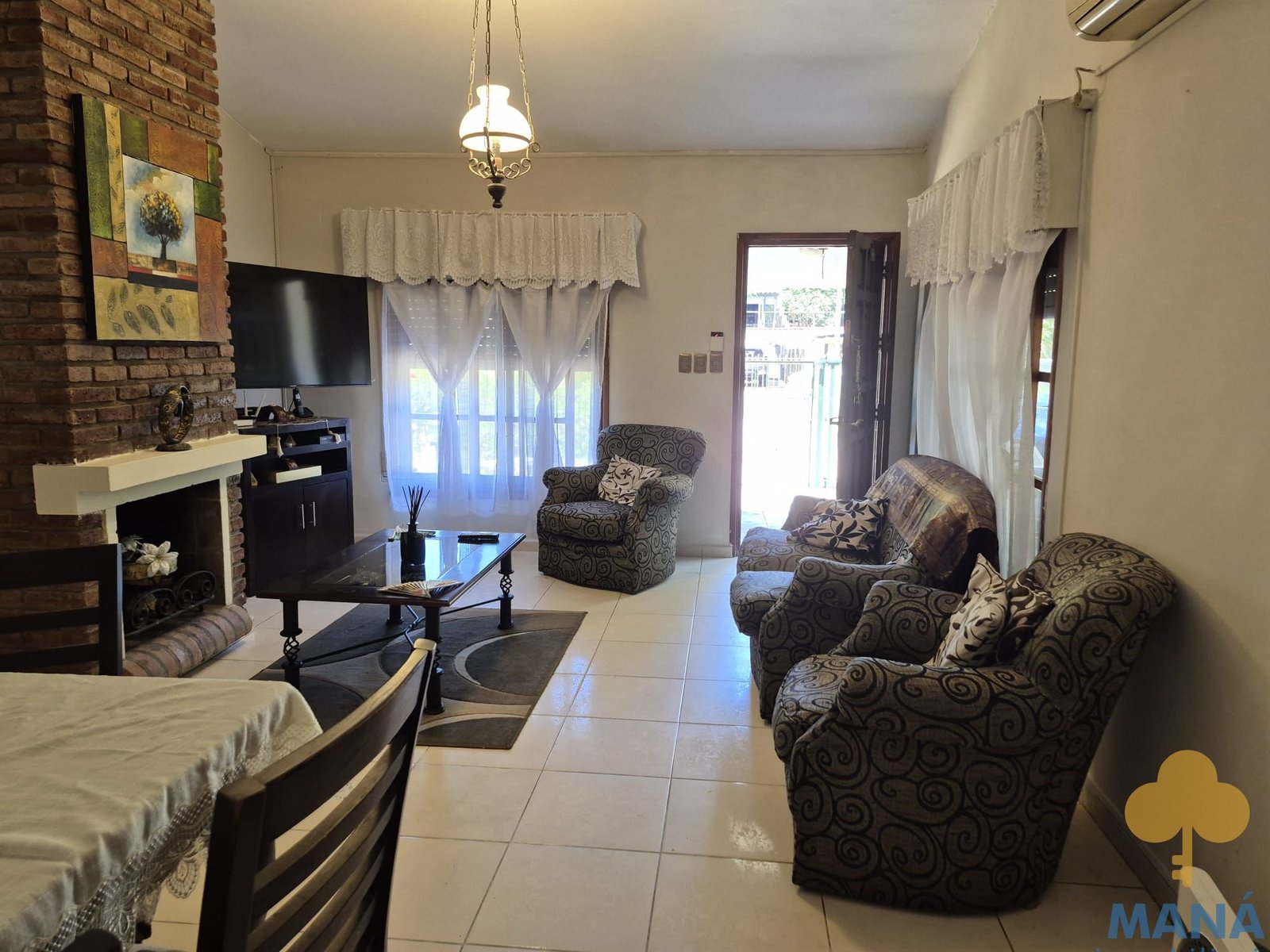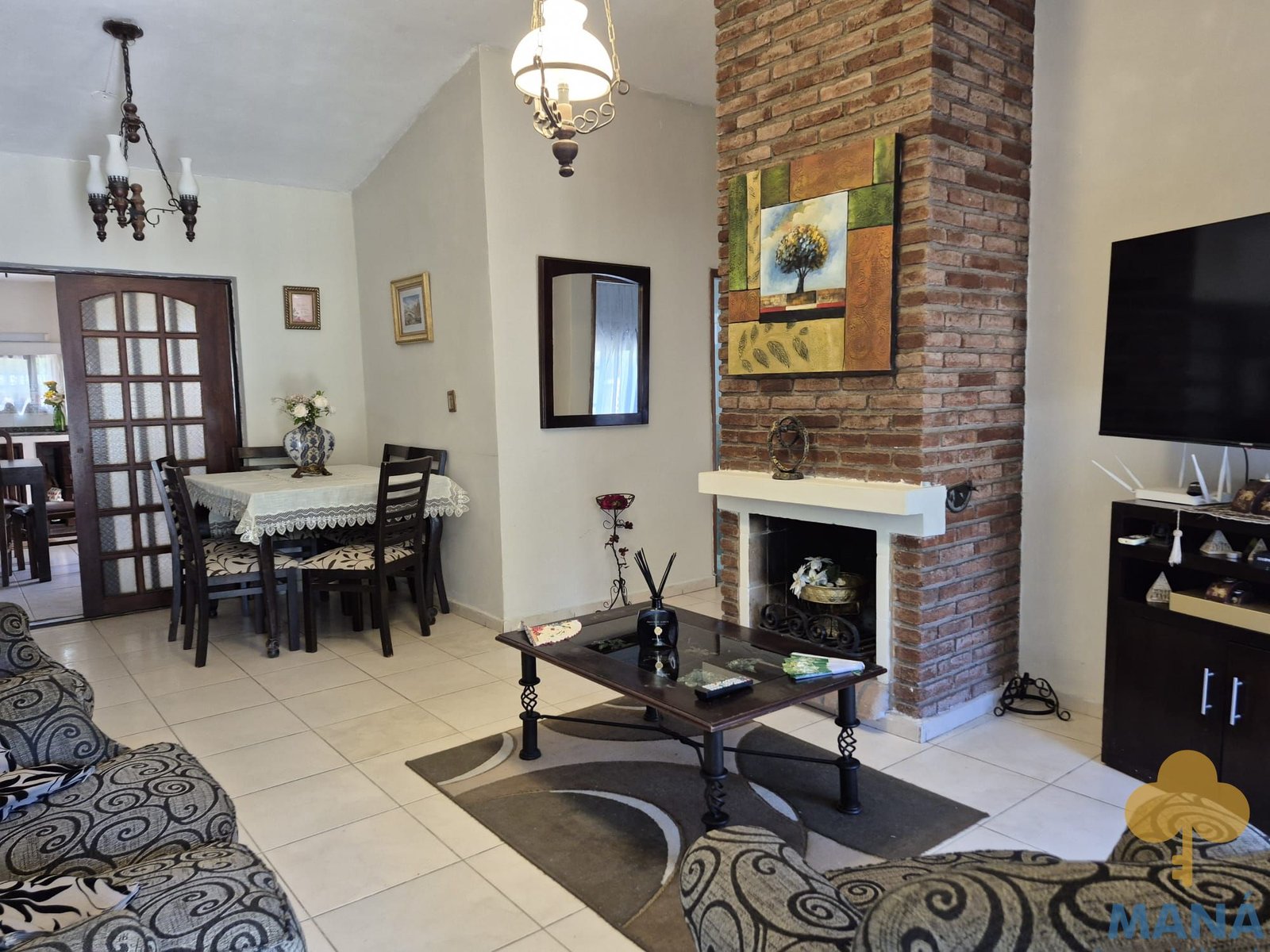 Living comedor con estufa a leña, amplia cocina comedor definida con placares bajo mesada.