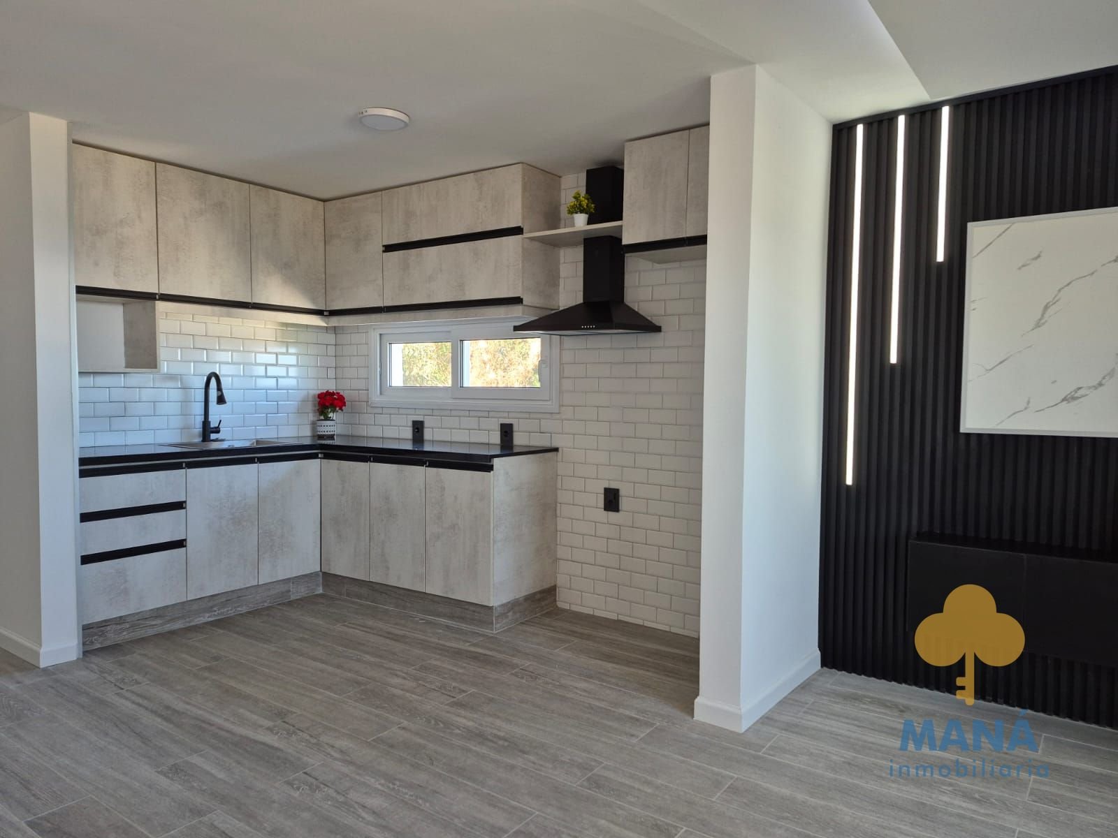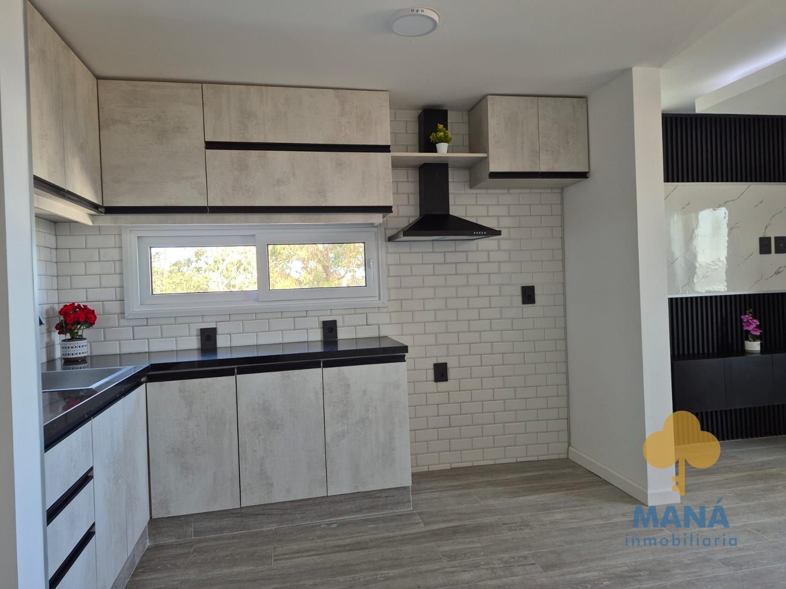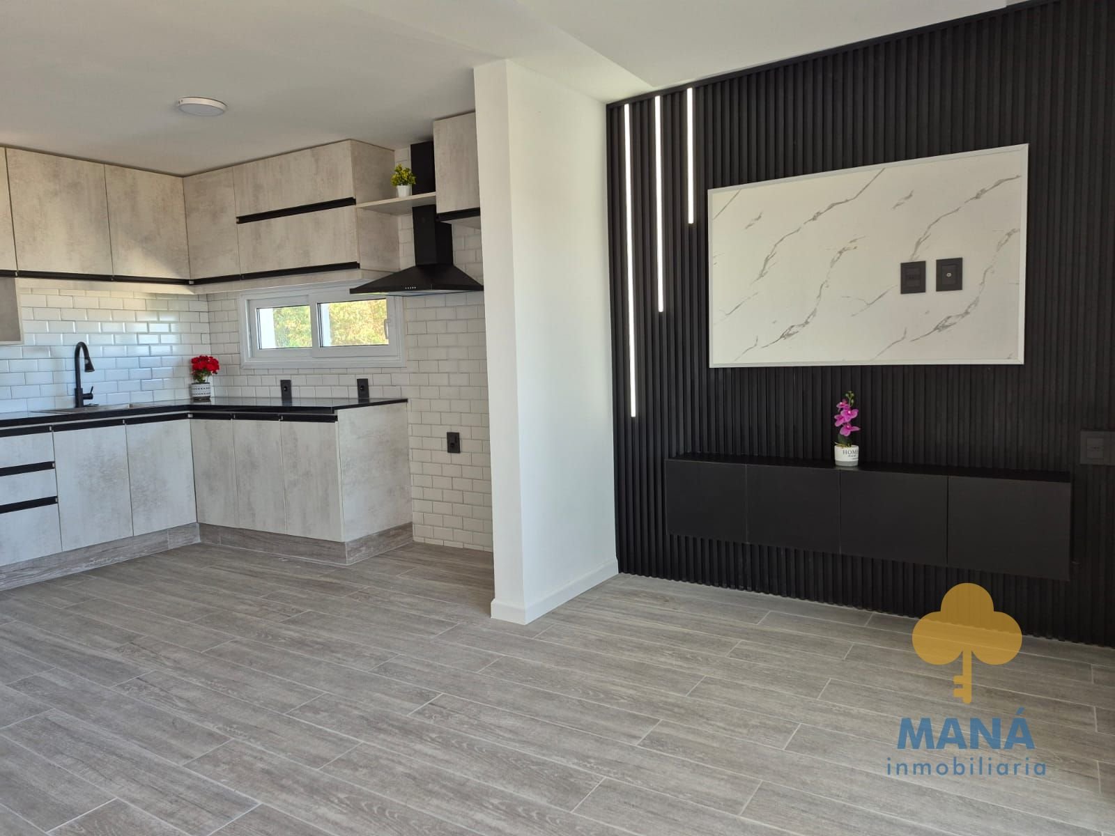 Living con grandes ventanales con vista al mar, cocina integrada con placares de excelente calidad, bajo mesada y aéreos, también con vista al mar.