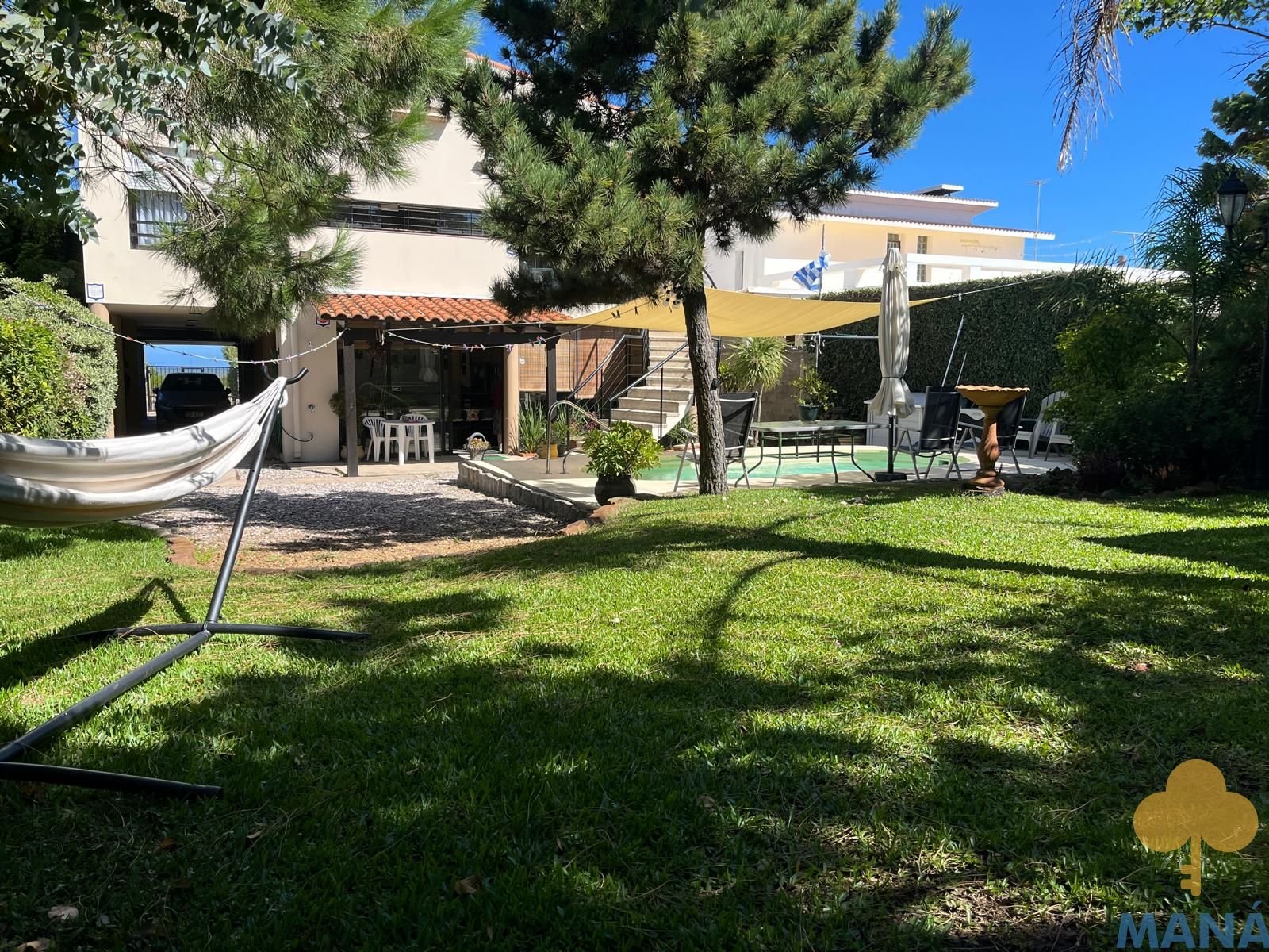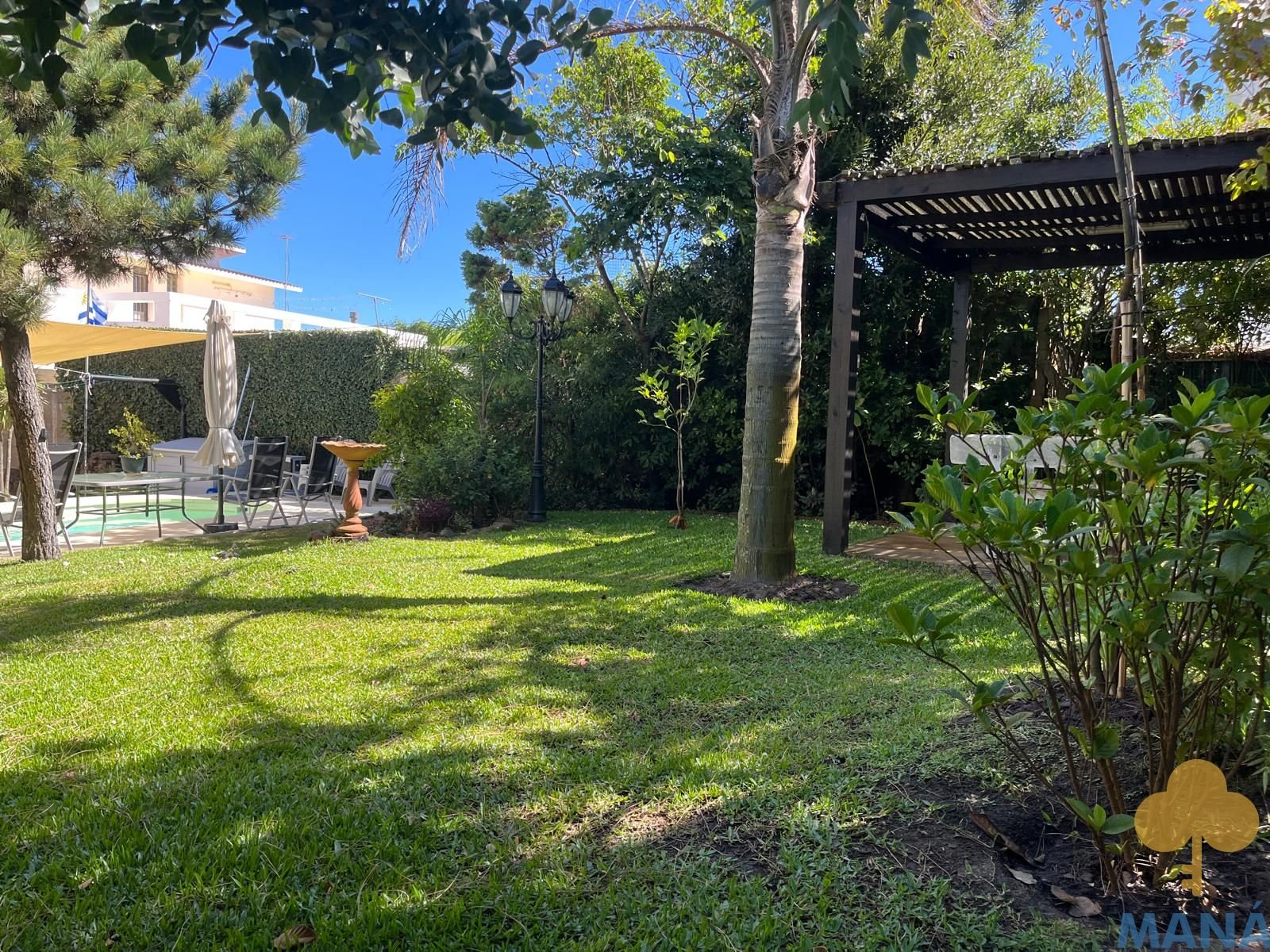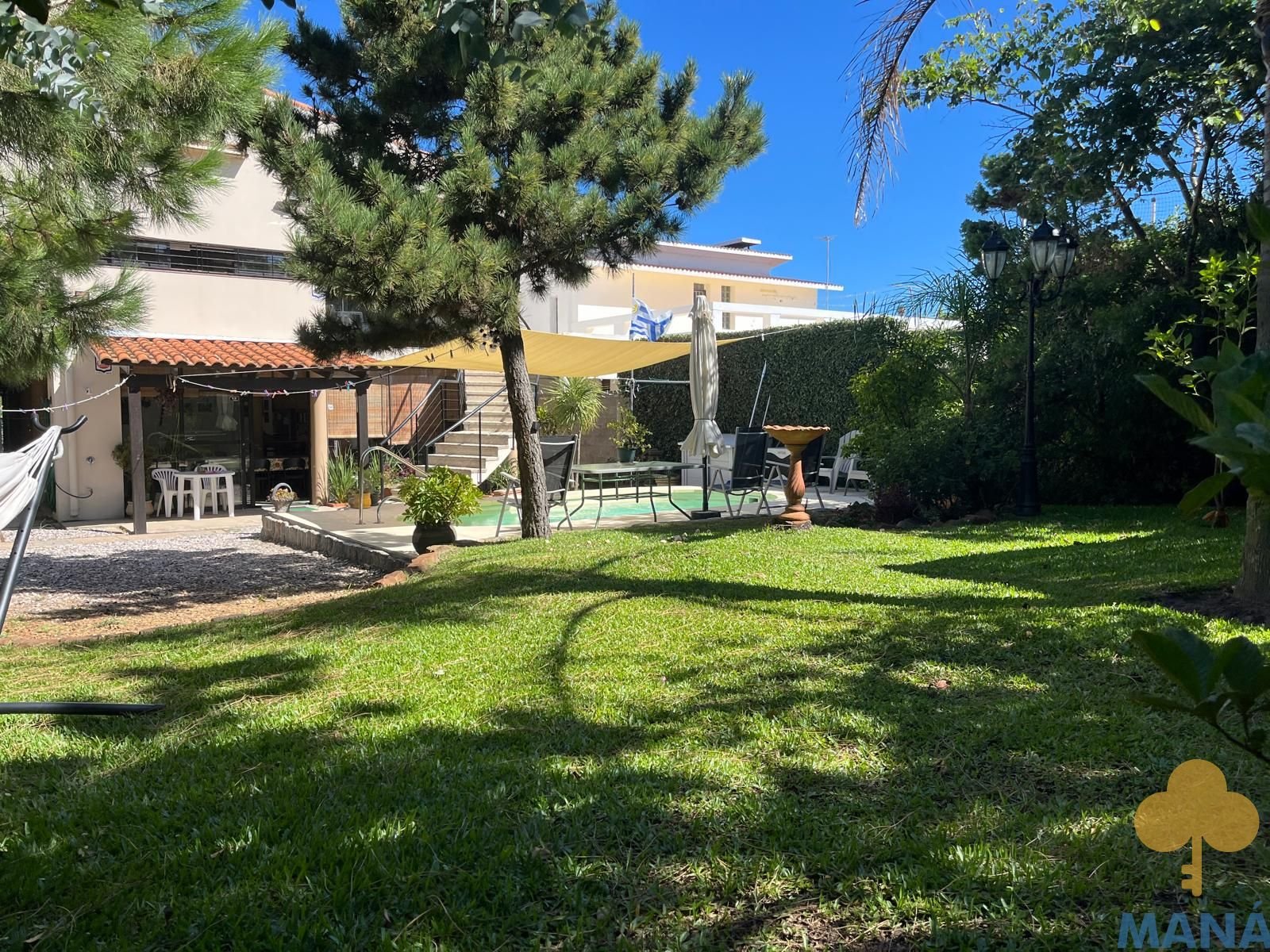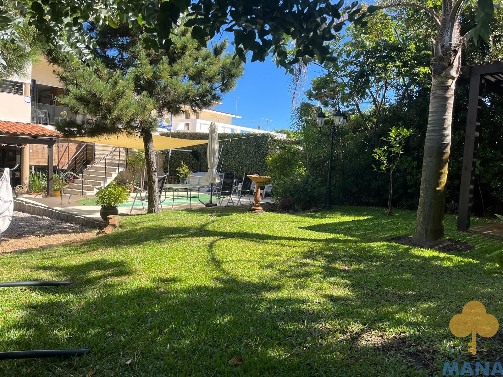 Jardín al frente con portón automatizado y jardín posterior con piscina climatizada y pérgola, creando un entorno privilegiado para disfrutar al aire libre en todas las estaciones, ambos con un excepconal parquizado y cuidado con sistema derigo.