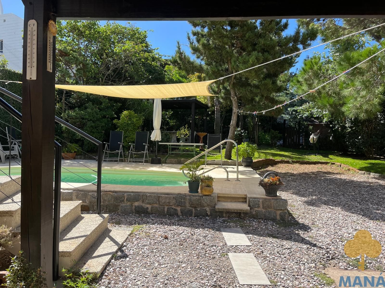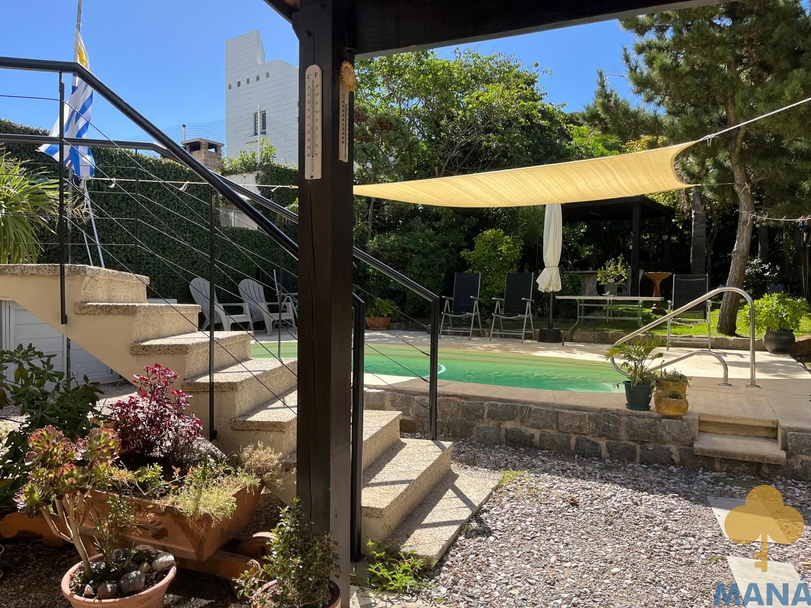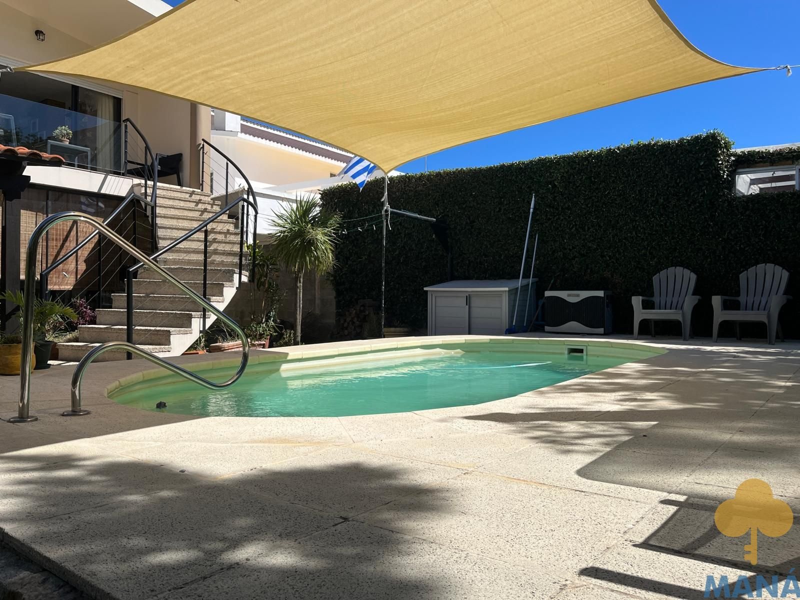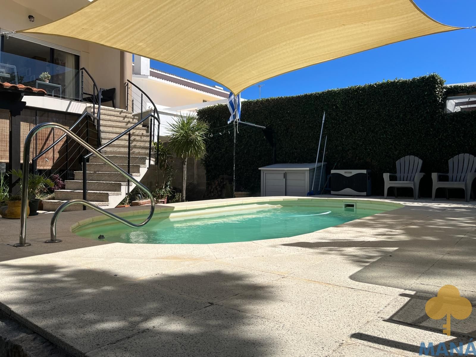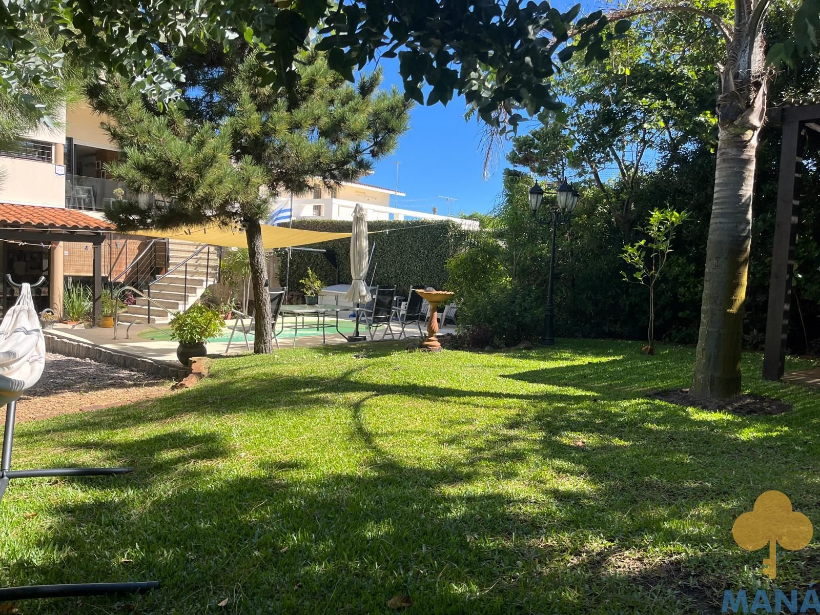 Jardín al frente con portón automatizado y jardín posterior con piscina climatizada y pérgola, creando un entorno privilegiado para disfrutar al aire libre en todas las estaciones, ambos con un excepconal parquizado y cuidado con sistema derigo.