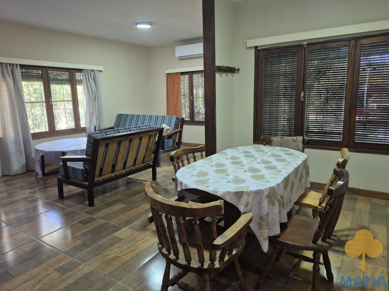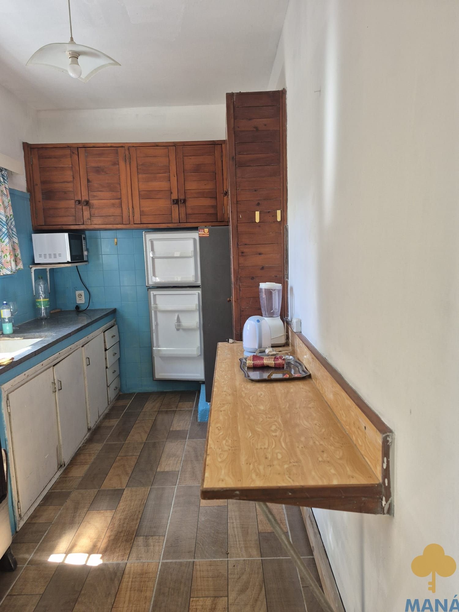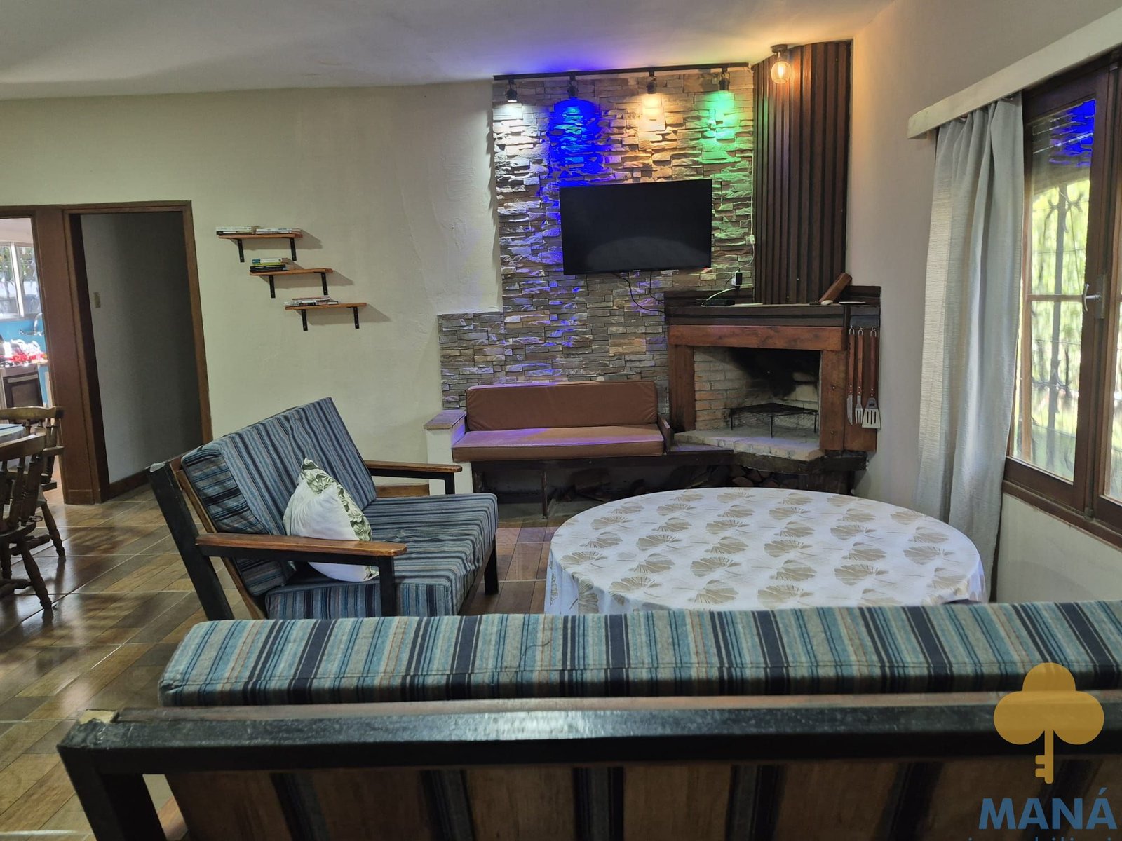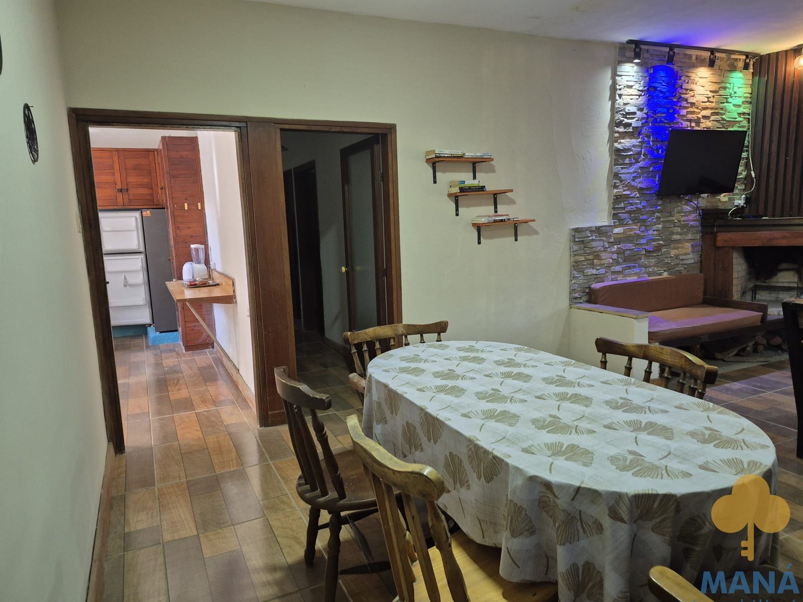 Amplio living comedor con estufa a leña, cocina definida con placares bajo mesada y aéreos.